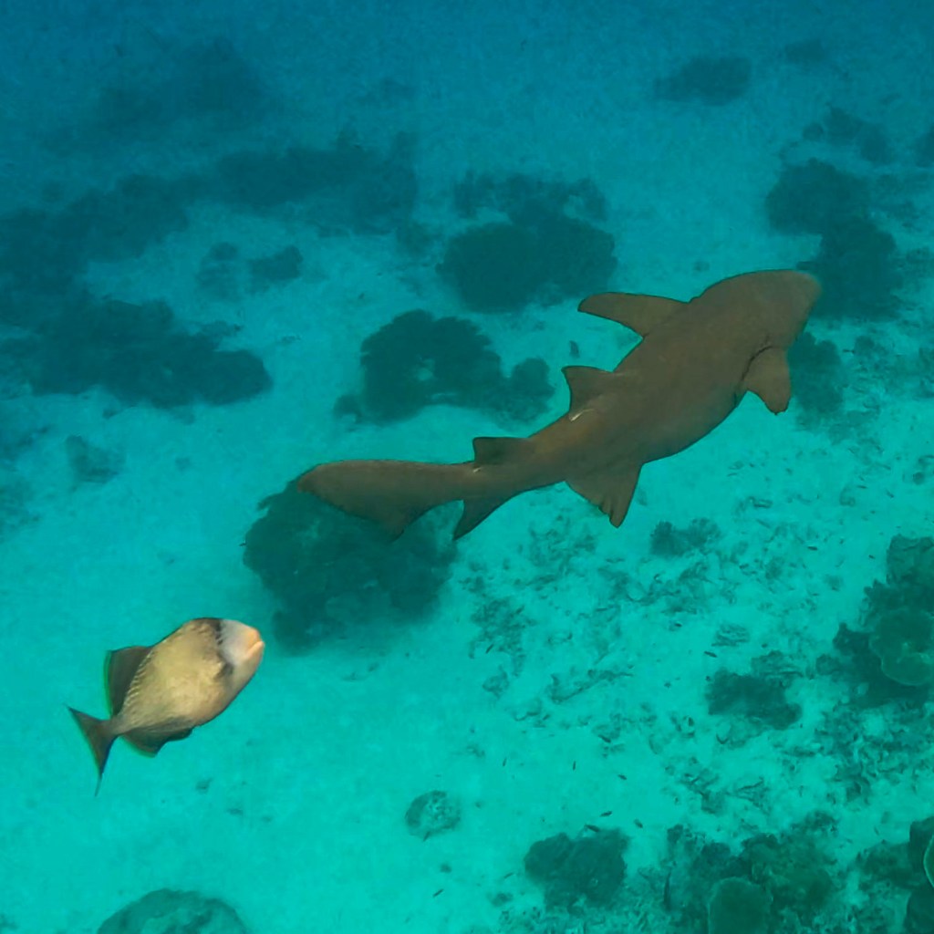 Swimming with sharks — This was, without exaggeration, one of the most surreal experiences of our lives. Being in the water with reef sharks, watching them glide past just meters away, feeling the thrill mixed with absolute peace… there’s no photo that captures it. Every single day we swam with sharks. It became our new normal. And honestly? We miss it.